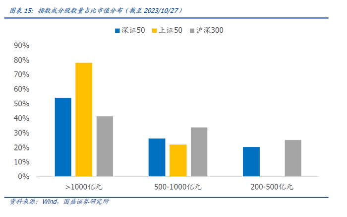 从成分股市值分布来看,深证50指数成分股整体偏向大市值风格。截至2023年10月27日,指数的50只成分股的平均总市值约为1565亿元,整体偏向大市值风格。从与上证50、沪深300的成分股的市值分布对比来看,深证50成分股总市值1000亿以上的成分股数量介于上证50与沪深300之间,因此指数成分股整体偏大市值风格但相比上证50指数而言市值较小一些。