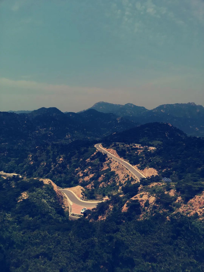 道路沿山蜿蜒而上,山上植被郁郁葱葱,莽莽林海之中偶现峥嵘巨岩,山野美景令人心旷神怡。