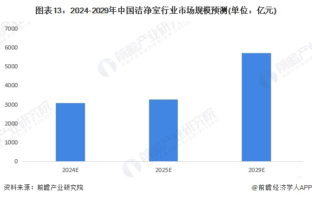 “十四五”明确聚焦新一代信息技术、生物技术、新能源、新材料、高端装备、新能源汽车、绿色环保以及航空航天、海洋装备等战略性新兴产业,加快关键核心技术创新应用,加快生物医药、生物育种、生物材料、生物能源等产业的发展。未来,以上高科技产业的快速发展将进一步带动洁净室市场规模的高速增长目前我国洁净室行业已进入规模效应体现、上下游产业链配套的稳定发展阶段。预计未来洁净室行业将保持低速稳定增长,未来五年市场规模CAGR约为15%,预计2029年中国洁净室市场规模超5700亿元。