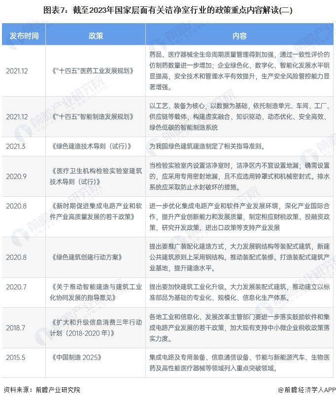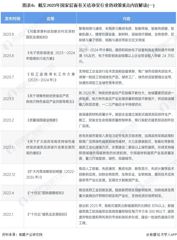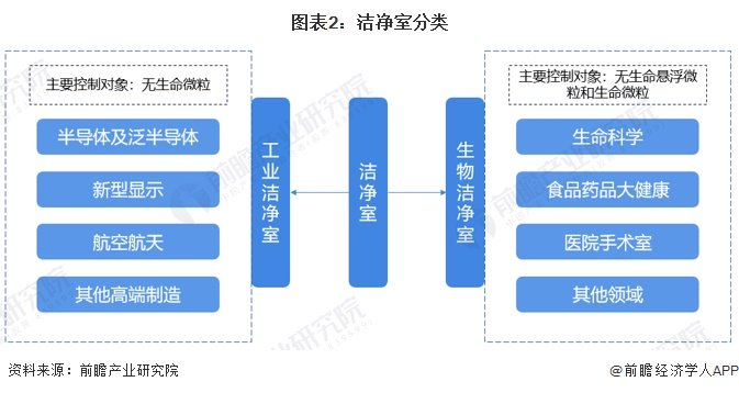 电子、医药以及食品等行业是洁净室的重点应用领域。近年来,我国持续出台相关政策,促进半导体、新型显示、生命科学、食品药品等行业的发展,从而促进了洁净室行业需求的增长。此外,洁净室行业属于建筑行业,国家持续出台促进建筑行业绿色化、智能化发展,大力推进洁净室建造所使用的BIM技术等信息技术的应用,推动装配式建筑的相关政策同样带动了装配式洁净室的发展。