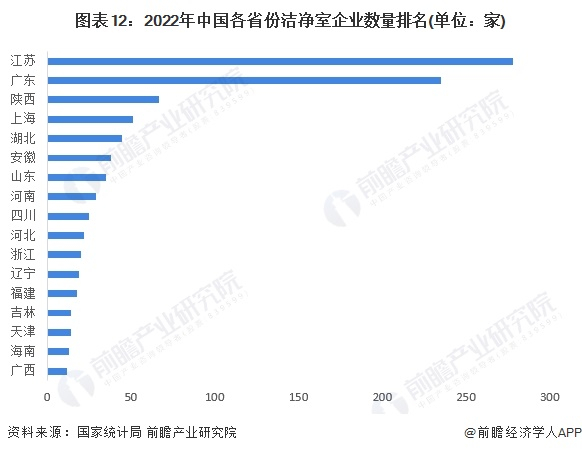 从各省份洁净室企业数量来看,目前江苏和广东两省洁净室企业数量最多,其中,江苏以278家洁净室企业数量排名第一。