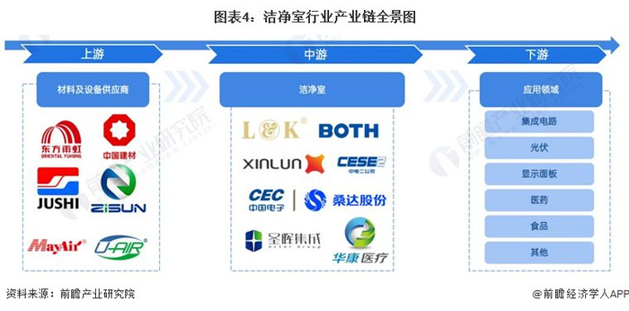洁净室行业主要依据下游产业对洁净室洁净程度与功能的要求从上游行业采购项目所需的材料与设备,为业主提供全流程洁净室系统集成专业服务。