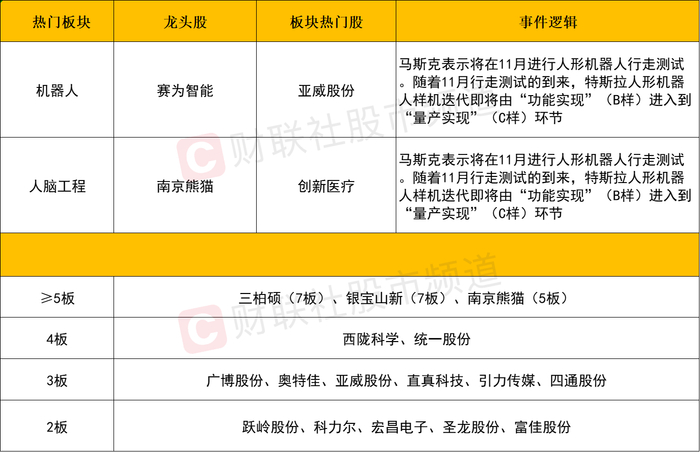 板块上,机器人概念股涨幅居前,赛为智能、万集科技、富佳股份、亚威股份、湘邮科技、智微智能、科力尔等个股涨停,绿的谐波、江苏雷利、昊志机电、丰立智能等个股涨幅居前。消息面上,7月特斯拉二季度业绩会上,马斯克表示将在11月进行人形机器人行走测试。随着11月行走测试的到来,特斯拉人形机器人样机迭代即将由“功能实现”(B样)进入到“量产实现”(C样)环节。