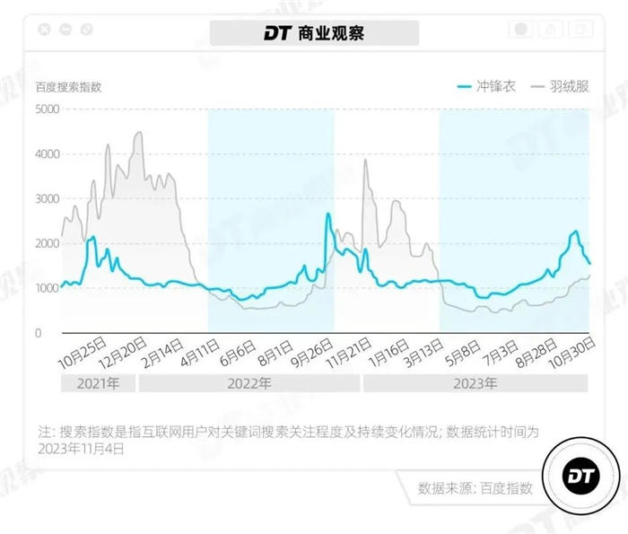 冲锋衣和羽绒服谁更保暖或许不能一概而论,但不可否认的是,今年以来,冲锋衣的热销对羽绒服的市场地位造成了一定的“威胁”。DT商业观察数据显示,2023年5月-10月冲锋衣百度搜索指数持续高于羽绒服。