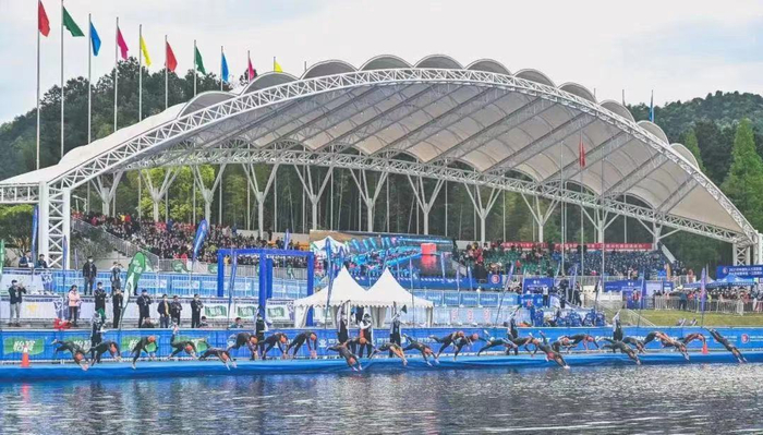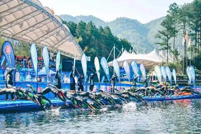 2018年中国铁人三项联赛在德兴举办,2019年德兴比赛升级为亚洲杯赛全国冠军赛暨U系列冠军赛、联赛同期举办,近20个国家的800余名运动员参赛。5年来,德兴铁三从无到有,深入人心。图为2023年铁人三项亚洲杯赛暨中国铁人三项联赛现场。