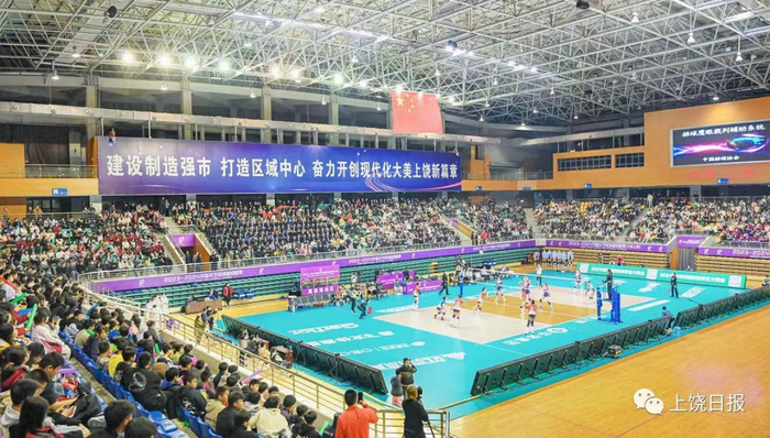 上饶市体育中心(馆)、体育场总建筑面积10万平方米,建筑等级为甲级,可以举办全国性和单项国际比赛。图为2023-2024中国女子排球超级联赛在上饶市体育中心举办,现场人头攒动,热闹非凡。徐斌 摄