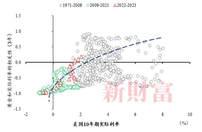 第一个原因,黄金价格仍然受到实际利率影响,但实际利率水平越高,两者之间的关系越弱。从2022-2023年的周度黄金价格和实际利率数据可以看到,黄金价格仍然受到实际利率的影响,但是不同时期黄金价格对利率的弹性存在差异,2021年实际利率较低,黄金价格对实际利率变动更敏感,实际利率下降1个百分点,黄金价格上涨158美元,而2023年实际利率明显上升后,黄金价格对实际利率的敏感程度下降,实际利率下降1个百分点,黄金价格只上涨66美元。从更长的历史序列来看,实际利率位于高位时,黄金价格对实际的敏感程度也下降。