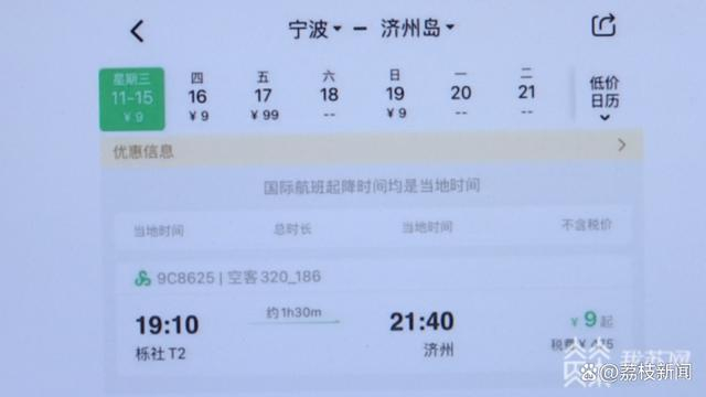 记者通过多个旅游票务平台看到,近期春秋航空宁波飞济州岛的机票,票价是9元,算上税费等,单程不到500元。