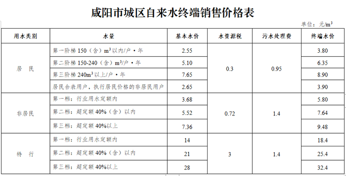 (二)非居民用水和特种行业用水实行超定额累进加价制度。非居民用水终端水价调整为5.8元/m³,特种行业用水终端水价调整为18.4元/m³,特种行业用水按照咸阳市发展和改革委员会《关于咸阳市城区实施非居民用水超定额累进加价制度的通知》(咸发改物价〔2019〕478号)规定,执行超定额累进加价制度,分档水量和加价标准同非居民用户一致。