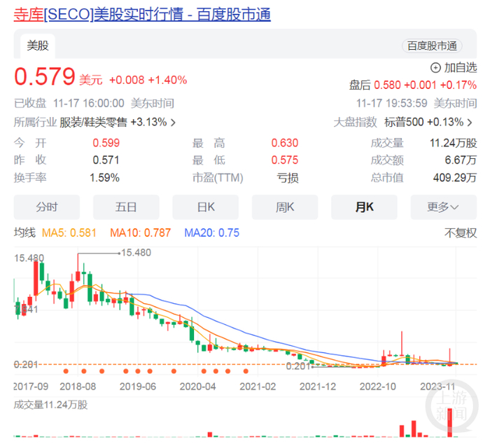 上游新闻记者看到,寺库股价自2021年12月以来长期在1美元以下徘徊,仅在2022年底到2023年初以及今年10月,有短暂冲上1美元的情况。截至上周五,寺库股价收报0.579美元,涨1.4%,成交量仅8000多股。