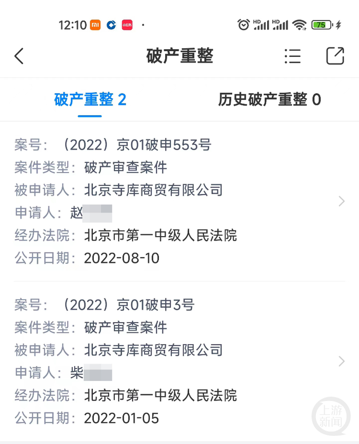 据全国企业破产重整案件信息网显示,申请人柴某某曾向北京一中院以“北京寺库商贸有限公司不能清偿到期债务,并且明显缺乏清偿能力”为由申请对北京寺库商贸有限公司进行破产清算,2022年1月6日,北京一中院发出民事裁定书,称“本院审查期间,柴某某申请撤回对北京寺库商贸有限公司的破产清算申请”,法院最后裁定,准许柴某某撤回破产清算申请。