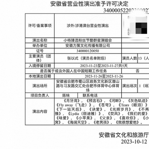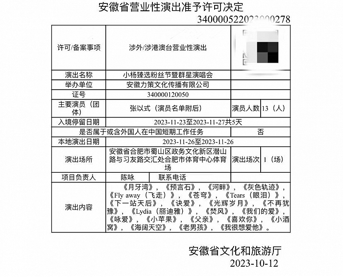 安徽省文化和旅游厅的一份演出准予许可文件透露了更多信息,“小杨臻选粉丝节暨群星演唱会”已经在10月12日通过审批,举办单位为安徽力策文化传播有限公司,演员人数为13人,其中以港台歌手为主。