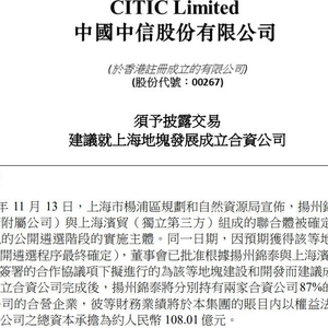 11月13日,中国中信股份有限公司(简称“中信股份”)发布公告称,上海市杨浦区规划和自然资源局宣布,扬州锦泰与上海滨贸组成的联合体,被确定为上海杨浦区四宗地块的公开遴选阶段的实施主体。