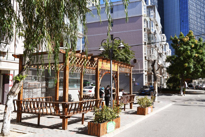 走进中上园5号院,挑高的木质廊架搭配着同色系桌椅、栅栏、花箱,一片颇具设计感的休闲空间映入眼帘。三五居民在花坛旁闲唠家常。“以前可没这个好心情,小区环境脏乱差不说,大门口天天堵车,惹一肚子气。”67岁李阿姨口中的“堵车”是两年多前小区里的生活常态。