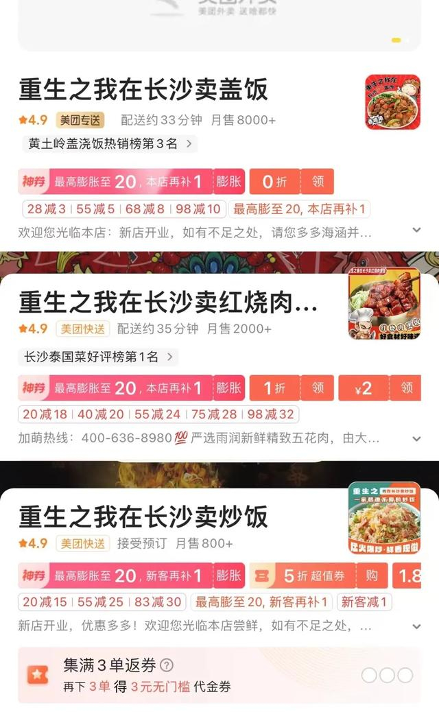 重生之我在长沙卖“盖饭、炒饭、红烧肉煲饭、盒饭”。一家“重生”店铺1个月售出近万单,在该店的评价区,有吃过的人表示被该创意圈粉,“被名字吸引了,没想到真的好吃。”也有人直呼避雷,“名字很有意思,像网文小说,感觉老板是个有想法的人,饭一到手上,我只能说,太难吃了。”