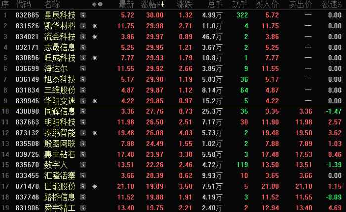 多只北交所股票放量大涨,接近100股量比达到10倍以上。9只股票早盘收获30cm的涨停板,包括星辰科技、志晟信息、海达尔、旭杰科技、华阳变速、三维股份等。此外,还有80只个股涨幅超10%。