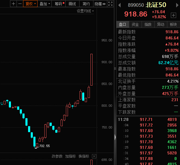 11月21日早盘,北交所股票全线爆发,231只股票均为飘红状态,为历史上第3次个股全部上涨,前两次分别是2022年3月17日和2023年1月31日。截至早间收盘,北证50指数上涨超9%,创历史最大单日涨幅。