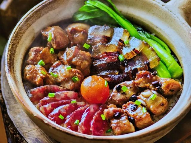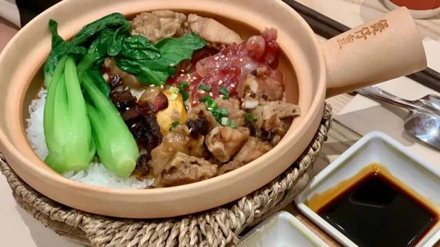 镇店腊味四宝煲仔饭,有腊肠、腊肉、鸡肉、排骨,再加上“点睛之笔”咸鸭蛋,蛋黄铺上绿油油的小青菜,配上茉莉香米,倒入精心酿制的煲仔汁。一口吃进嘴里,唇齿之间,回味无穷。