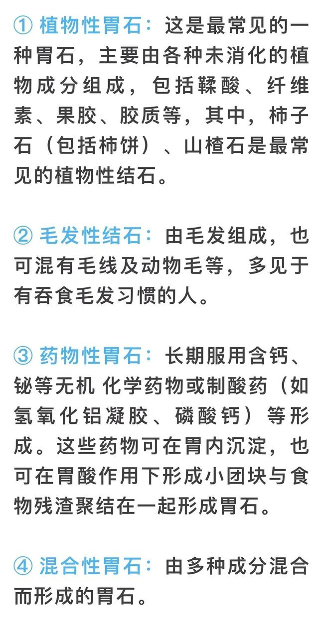 胃石(gastric bezoar),又称胃结石、胃石症,是患者摄入不能消化的物质在胃内潴留形成的团块状物质,这些物质既不能被消化,也不能顺利通过幽门部,就会在胃内停留时间变长,在胃酸的作用下逐渐形成结石。