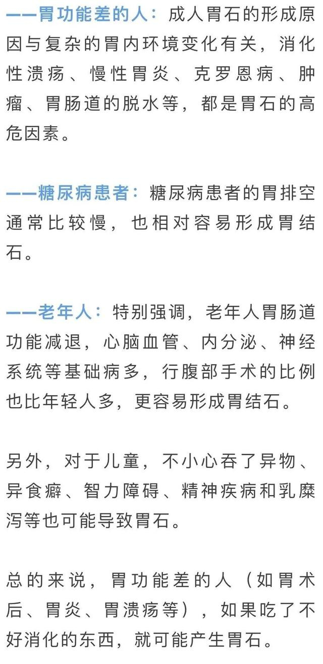 只要是容易发生这些情况的人,他们就容易产生胃石。从目前胃石症患者的流行病学调查分析来看,胃石易发生在老年人群、糖尿病患者,既往有消化性溃疡等胃部疾病的人群。