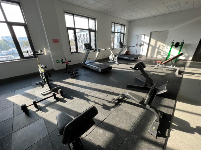 在食堂二层,设有免费使用的健身器材。