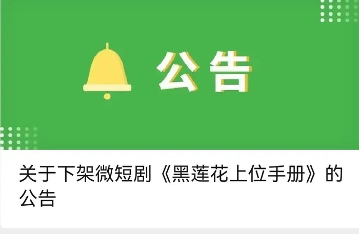 在专项治理期间,平台发现微短剧《黑莲花上位手册》渲染极端复仇、以暴制暴的不良价值观,混淆是非观念,破坏平台良好生态,平台已将该剧下架,现予以公示。