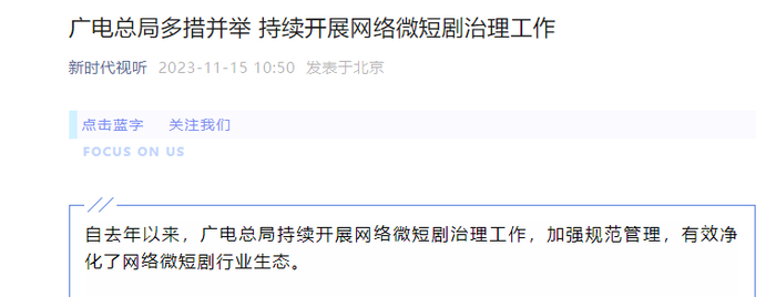 另据国家广播电视总局网络视听节目管理司“新时代试听”微信公号消息,自去年以来,广电总局持续开展网络微短剧治理工作,加强规范管理,有效净化了网络微短剧行业生态。