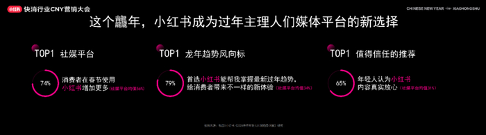 同时,63%的消费者会在小红书上借鉴年货清单,同时在各种社交媒体上,首选小红书推荐的品质礼赠,包括年夜饭在内的新年餐桌文化也首选在小红书上进行参考与分享。