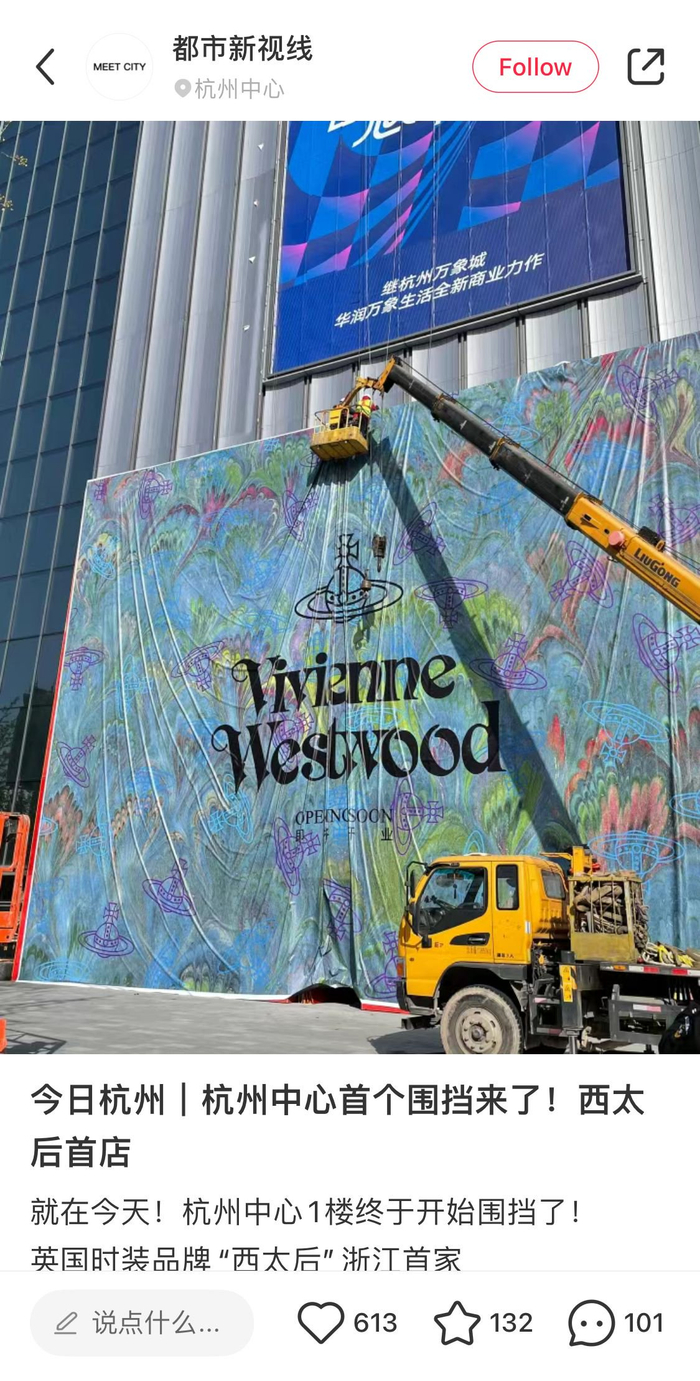 英国设计师品牌Vivienne Westwood最近在杭州中心围挡了一家店。这是它在杭州的首家门店,铺位临街且有双层零售空间。作为武林广场地铁站的上盖项目,杭州中心是华润在这座城市的又一个重点投资项目。