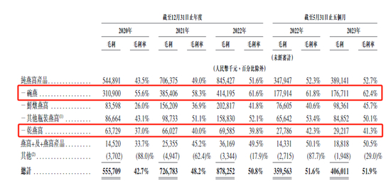 资料显示,2020年-2022年及2022年、2023年的前5个月(下称“报告期”),燕之屋总收入依次为13.01亿元、15.07亿元、17.3亿元、6.97亿元、7.83亿元。其中,纯燕窝产品分别贡献12.54亿元、14.43亿元、16.38亿元、6.65亿元、7.39亿元。