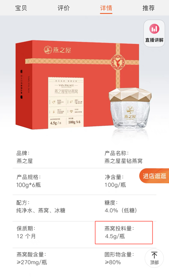如2022年上市的碗燕星钻款,在淘宝旗舰店内,星钻6碗装礼盒活动到手价为1830元,折算每碗305元,对应净重100克。同时其详情页写明,该产品配方为“纯净水、燕窝、冰糖”,其中燕窝投料量为4.5克。