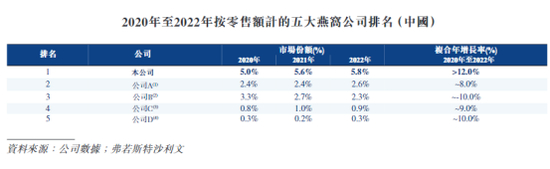 聆讯后资料集中写明,中国燕窝行业较为分散,有超过10000名参与者。按零售额计算,2022年,燕之屋于中国燕窝市场排名第一,市占率约5.8%,且中国前五大燕窝公司所占合并市场份额为11.9%。