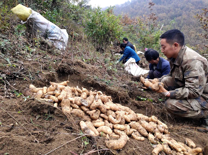 村民们在林下种植基地里挖天麻