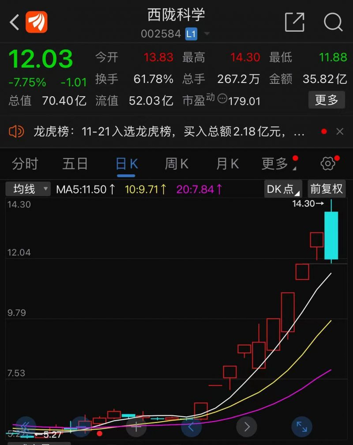 西陇科学股价涨停“熄火”或来自监管的关注。11月20日晚间,深交所向9天8板的西陇科学下发了关注函。截至11月21日收盘,西陇科学收报12.03元/股,跌7.75%。
