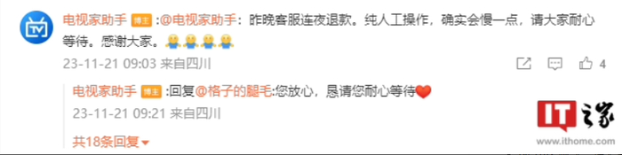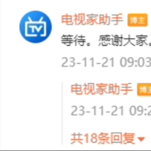 电视家助手官微今天早上还表示:“昨晚客服连夜退款,纯人工操作,确实会慢一点,请大家耐心等待。感谢大家”。