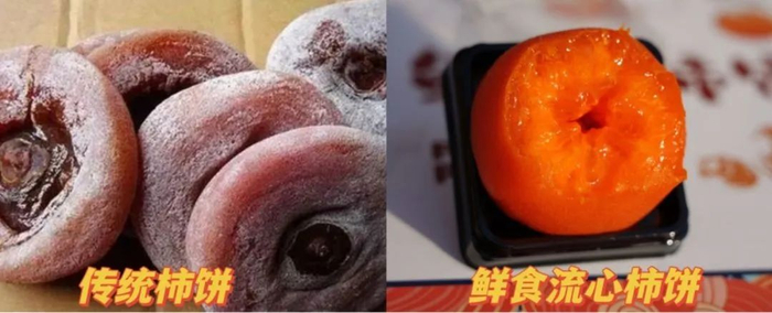 不用传统干瘪的上霜柿饼,鲜食流心柿饼是烘烤出的半干柿饼,口感界于新鲜柿子和干瘪柿饼之间。
