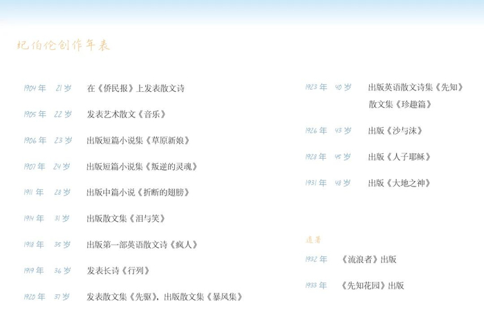 新增附录作者创作年表,带您快速了解纪伯伦创作生涯。