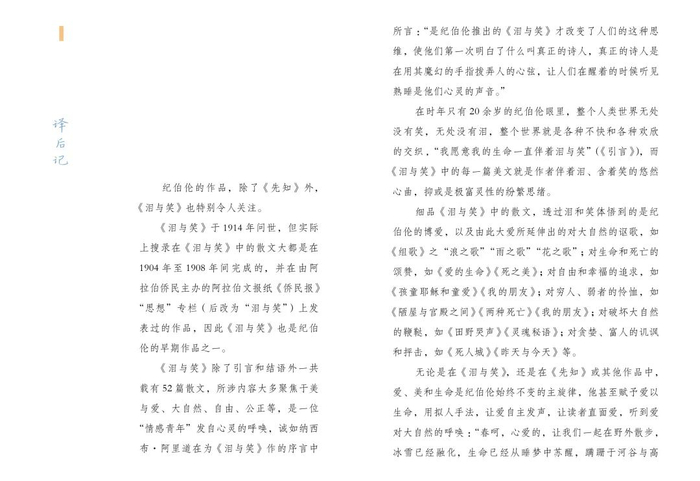 纪伯伦作品的译本繁多,但只有好的译本配合好的译者,才能将作者那原汁原味、富有个人特色的文风译出,使读者不偏不倚地体会到他的美。
