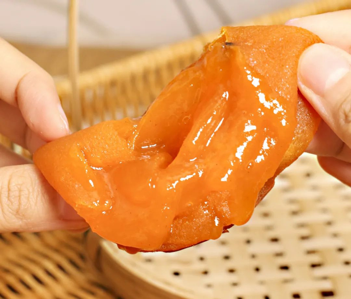 不用传统干瘪的上霜柿饼,鲜食流心柿饼是烘烤出的半干柿饼,口感界于新鲜柿子和干瘪柿饼之间。