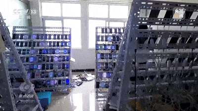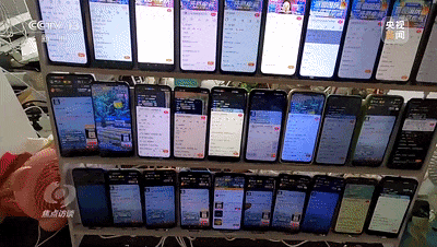 在一个手机搭建的实体机房里,密密麻麻地排列着600多部手机。