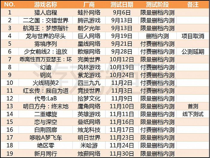 矩阵列表统计了今年第三季度公测与内测的部分二次元游戏名单,发现公测上线的二游依然数量庞大,并没有受到暑期二游表现不佳的影响。而内测二游中大量游戏已经进入付费删档测试,基本属于正式上线前的最后一测,可以预见明年的二游大战将继续打下去。