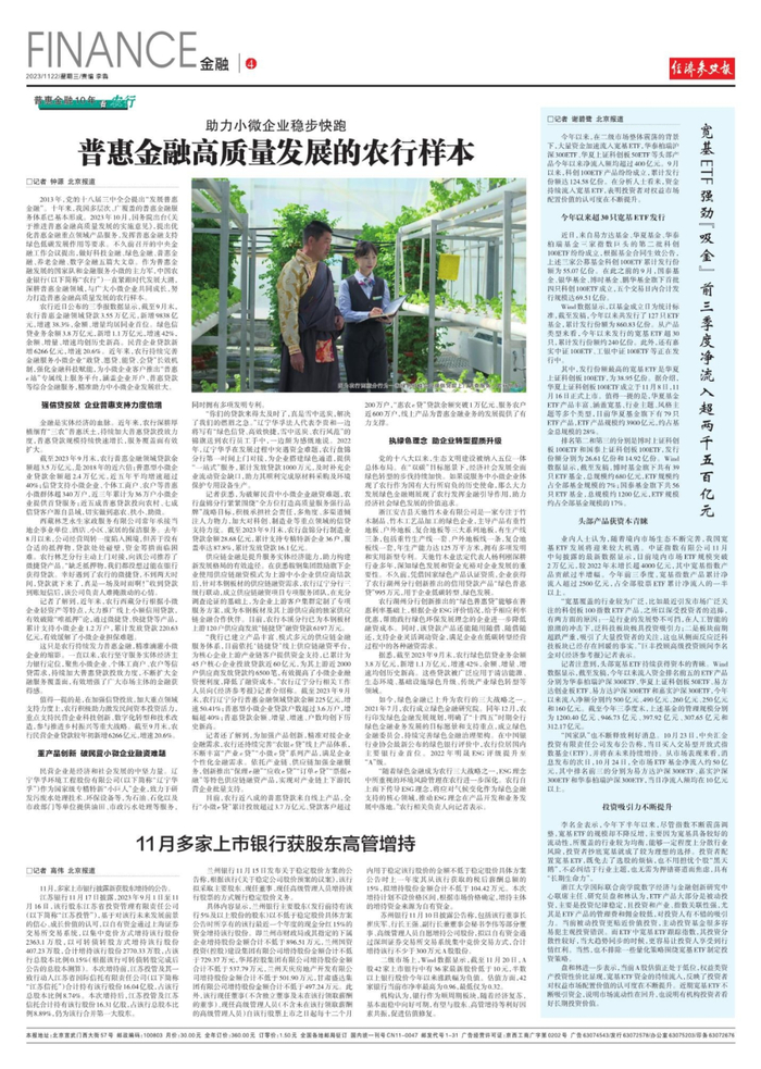 2013年,党的十八届三中全会提出“发展普惠金融”。十年来,我国多层次、广覆盖的普惠金融服务体系已基本形成。2023年10月,国务院出台《关于推进普惠金融高质量发展的实施意见》,提出优化普惠金融重点领域产品服务,发挥普惠金融支持绿色低碳发展作用等要求。不久前召开的中央金融工作会议提出,做好科技金融、绿色金融、普惠金融、养老金融、数字金融五篇大文章。作为普惠金融发展的国家队和金融服务小微的主力军,中国农业银行(以下简称“农行”)一直紧跟时代发展大潮,深耕普惠金融领域,与广大小微企业共同成长,努力打造普惠金融高质量发展的农行样本。