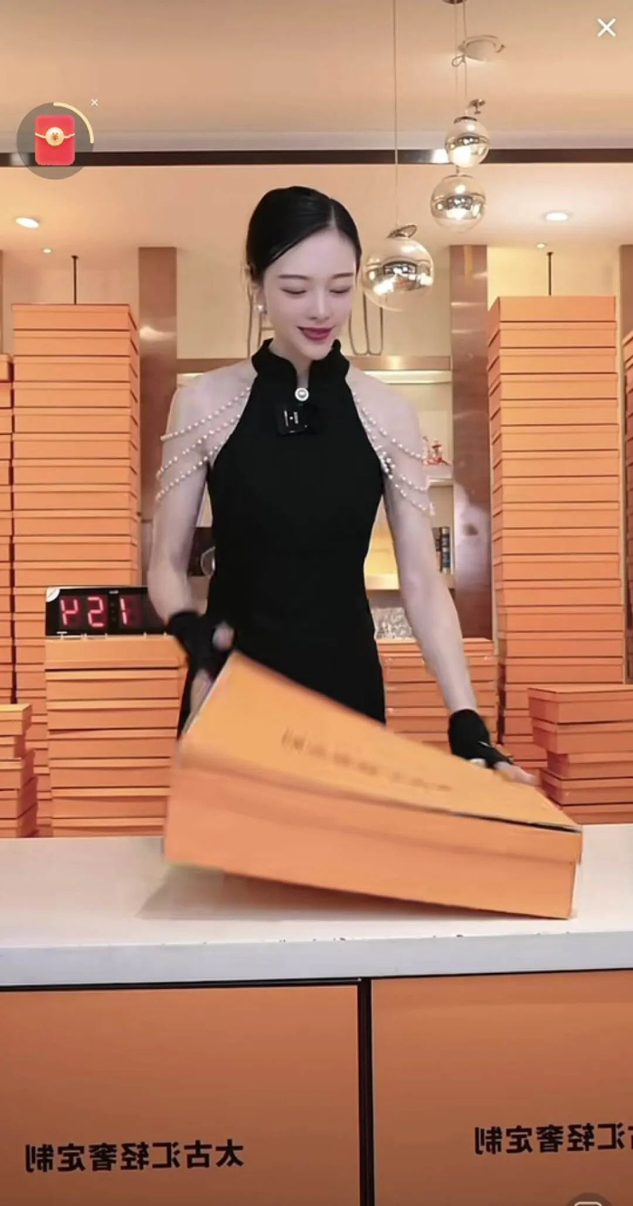 有的就相对粗糙了,背景接地气,用的盒子也不是爱马仕橙,最终效果和郑香香的直播截然不同。