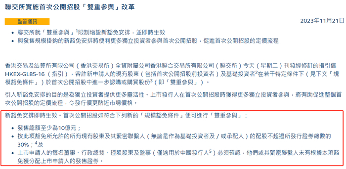 财联社11月22日讯(编辑 胡家荣)港交所在昨日公布一则消息,引发市场关注。港交所指出,容许新申请人的现有股东(包括首次公开招股前投资者)及基础投资者在若干特定条件下于首次公开招股中进一步认购或购买股份(即双重参与)。此外还指出,这一安排即时生效。