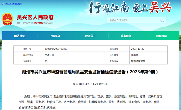 据通告,近期,湖州市吴兴区市场监督管理局组织抽检食用农产品、糕点、罐头、蔬菜制品、调味品、食糖、淀粉及淀粉制品、酒类、豆制品、粮食加工品、水产制品、食用油、油脂及其制品、饮料、乳制品、速冻食品、肉制品、餐饮食品等类别食品101批次样品。