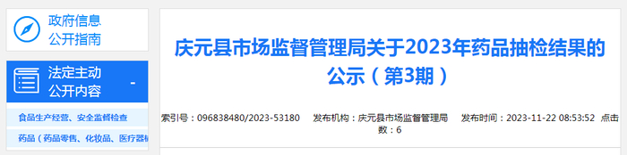 中国质量新闻网讯 2023年11月22日,浙江省庆元县人民政府网站发布庆元县市场监督管理局关于2023年药品抽检结果的公示(第3期)。