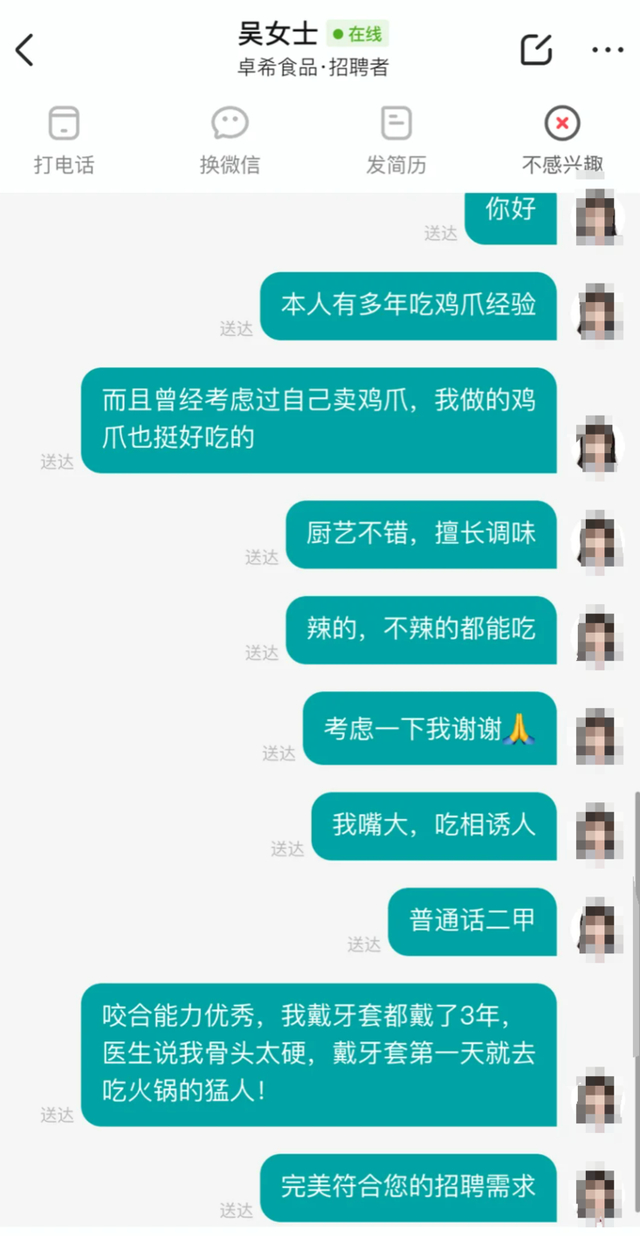 并且对于应聘者有下列几项条件满足可优先录取:在吃鸡爪的过程中能够清晰描述口感、味道,看完《舌尖上的中国》优先,普通话二级甲等以上,E人(社牛)优先,嘴大优先,吃相吸引人优先。