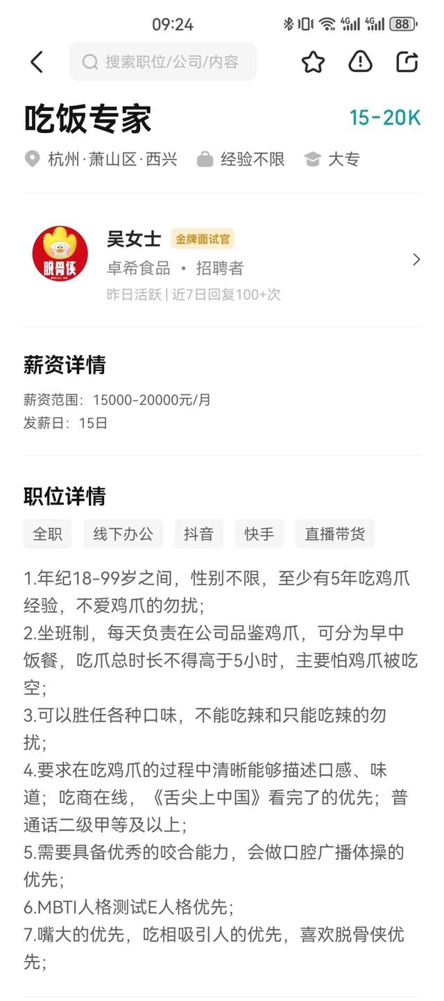根据截图显示,该食品公司开出月薪1.5万到2万元,招聘“吃饭专家”。职位要求:至少有5年吃鸡爪的经验,每天负责在公司品鉴鸡爪,可以胜任各种口味,吃爪总时长不得高于5小时。