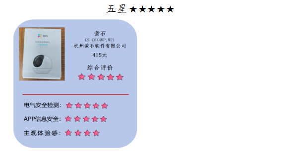 测试结果显示,15款家用摄像头样品中,1款样品“萤石”表现优秀,获五星;7款样品“小米、海雀(华为)、Haier、乐橙、TP-LINK、锐塔克、ZTE(中兴)”表现较好,获四星;2款样品“水星安防、Lenovo”表现一般,获三星;5款样品“华视纪、氧猎、小值、镭威视、魔方鸟”存在电气安全指标测试项目不符合国家标准及明示产品执行标准,不予评星,消费者可参考选购。测试结果仅对比较试验购买的样品负责。