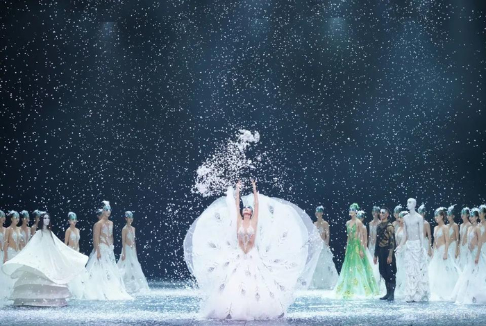 舞剧《孔雀》堪称视听觉盛宴,舞台上春夏秋冬四季交替变化,各种角色演绎灵魂碰撞的故事;音乐声则描绘自然万物,观众能听到民族乐器营造的风吹过的声音、时间流逝的声音,把观众带入空灵意境。